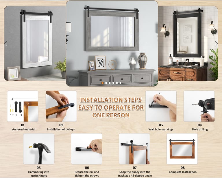 EASY TO INSTALL: The overall size of this rustic mirror is 40.9 x 26 x 0.67 inch, and the display size of the mirror is 34.6 x 18.9 inch. The track is 41 inch. You can fix the pulleys to the mirror first, then mount the track on the wall and finally snap the pulleys onto the track to complete the hanging